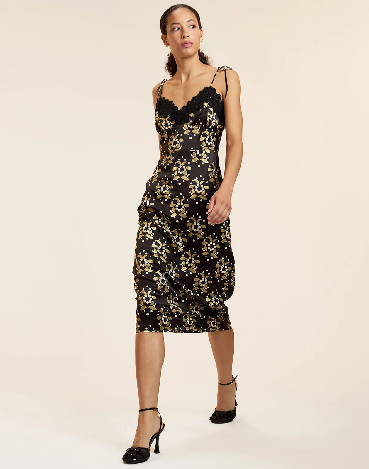 A silk midi dress with a filigree-inspired print — delicate, lace-like patterns that feel both elegant and romantic.